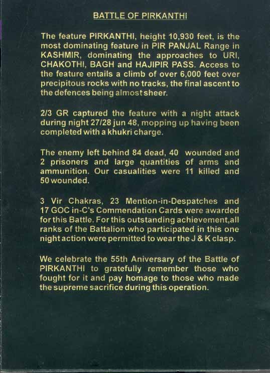 In fact these fellows never still really care much for the CO in 2/3rd, where the Subedar Major (SM) calls all the shots still in all administrative and welfare matters relating to the troops..Even during the assault on Pakistani-army-held Pir Kanthi feature in J&K on 27-28 June 1948, during the first war with Pakistan over Kashmir. The CO was reluctant to attack without adequate artillery fire support, but was over ruled by the S M saab, who admonished him for expecting the ideal text-book war-fighting conditions in military campaigns. He cited instances from the Allied campaign of 1942 in the Western Desert where he had worsted the panzers of Afrika Korps of the British-bug-bear, the German General Rommel – the original Desert Fox and given even him the jitters single-handedly. In the event, the 2/3rd boys legged it the up the mountain as fast as only the Gurkhas can. In short but classic section-level fire & move assault manoeuvres; without the supporting fire of the big guns; banking entirely only on the stutter of their own 303 Bren light machine guns (LMGs), merely for the sake of upholding the basic principle of “one leg on the ground” they reached the top and assaulted the objective with full throated battle-cries of “Ayo Gorkhali “on their lips! These doughty soldiers totally surprised the enemy with the speed and stealth of attack, capturing most of them in their beds and the others with their pants down in the latrines! The ones that resisted, were deftly dispatched in the lightening flashes of their drawn eleven-inch service khukris that were crying out to blooded in the true close-combat tradition and fighting spirit of these plucky peasant soldiers from the hills of Nepal. Capt Kaptan Singh Rana won a Vir Chakra as also did Lance Naik Purna Bahadur Thapa and Rifleman Jas Bahadur Thapa, 22 were Mentioned in Dispatches and 17 awarded commendations for gallantry. 11 made the supreme sacrifice and 50 wounded in action. The enemy paid a very heavy price too; they lost 54, with another 34 believed killed, and two were taken in as prisoners of war. Every one was much pleased, impressed and happy. The paltan won the Battalion battle honour “Pir Kanthi”, as result of which the Regiment got to get the Regimental Battle Honour “Uri”, the first to be won by the 3 Gorkha Rifles post-Independence