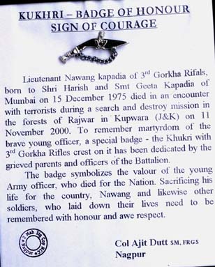 Many young cadets would come for training and at the completion of successful training; they would be given a certificate. Col. Dutt initiated a wonderful addition to be given along with the certificate, a memento in memory of Lt. Nawang Kapadia. It is a well-framed certificate with Nawang’s khukri in original on the top and the entire certificate well mounted and paying rich tributes to Lt. Nawang Kapadia, his sacrifice and asking young NCC cadets to follow the examples set by Lt. Nawang. This certificate was distributed to various NCC cadets who completed the course. They carried back the memory of this brave soldier of the Indian Army.
