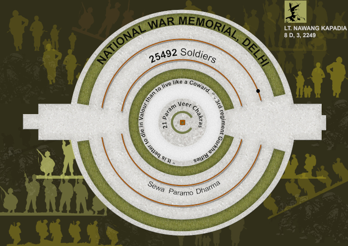The graphic represents an abstract top view of the ‘Chakravyuh’ of the National War memorial at Delhi. The names of the fallen soldiers have been engraved into stone in concentric circular red granite structures known as the Tyag chakras.